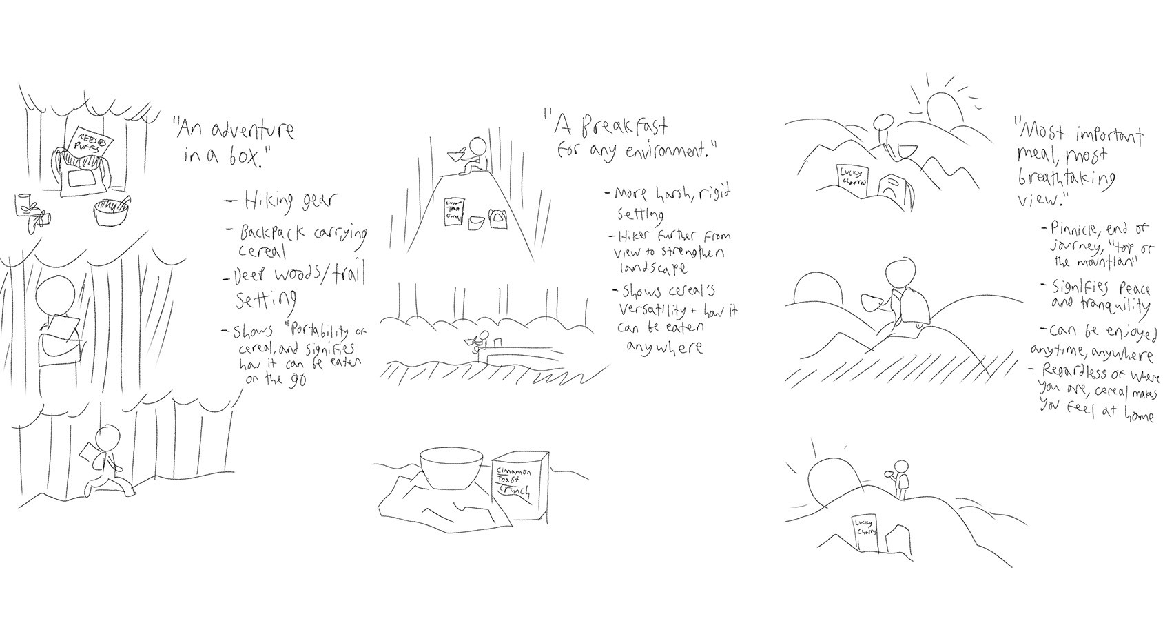 This series of posters combines elements of both demographics to show both the chronological order of hiking up a mountain and making a bowl of cereal. Both processes intertwine, with the hiker pouring the cereal at different stages of the journey. Combining the cereal element with scenic views of nature captivates both audiences.