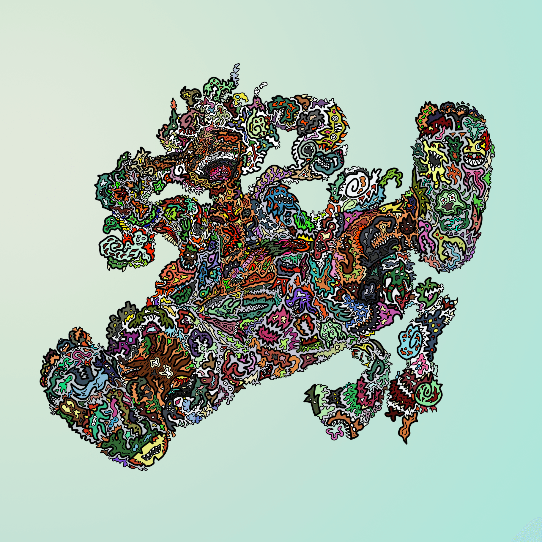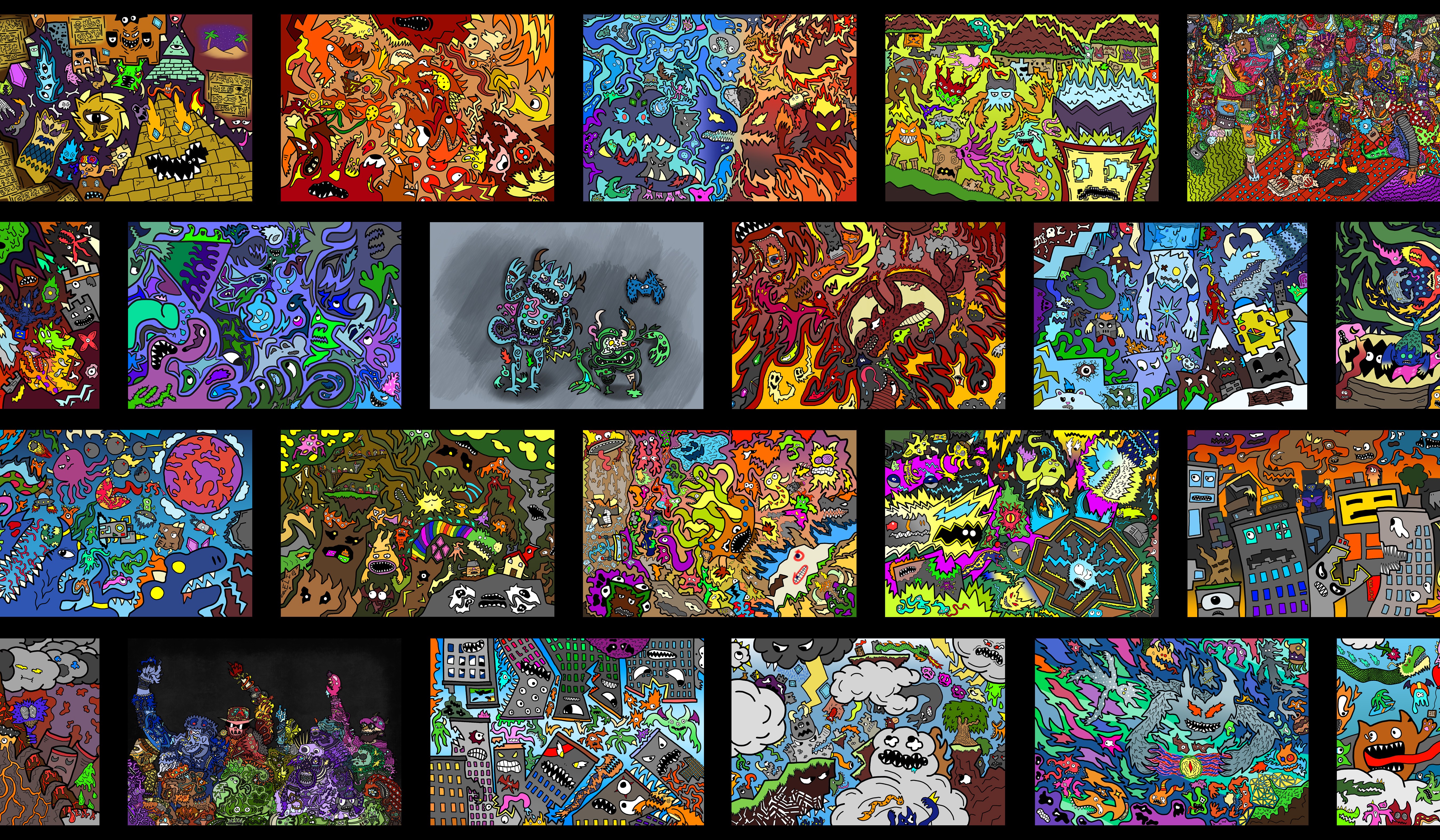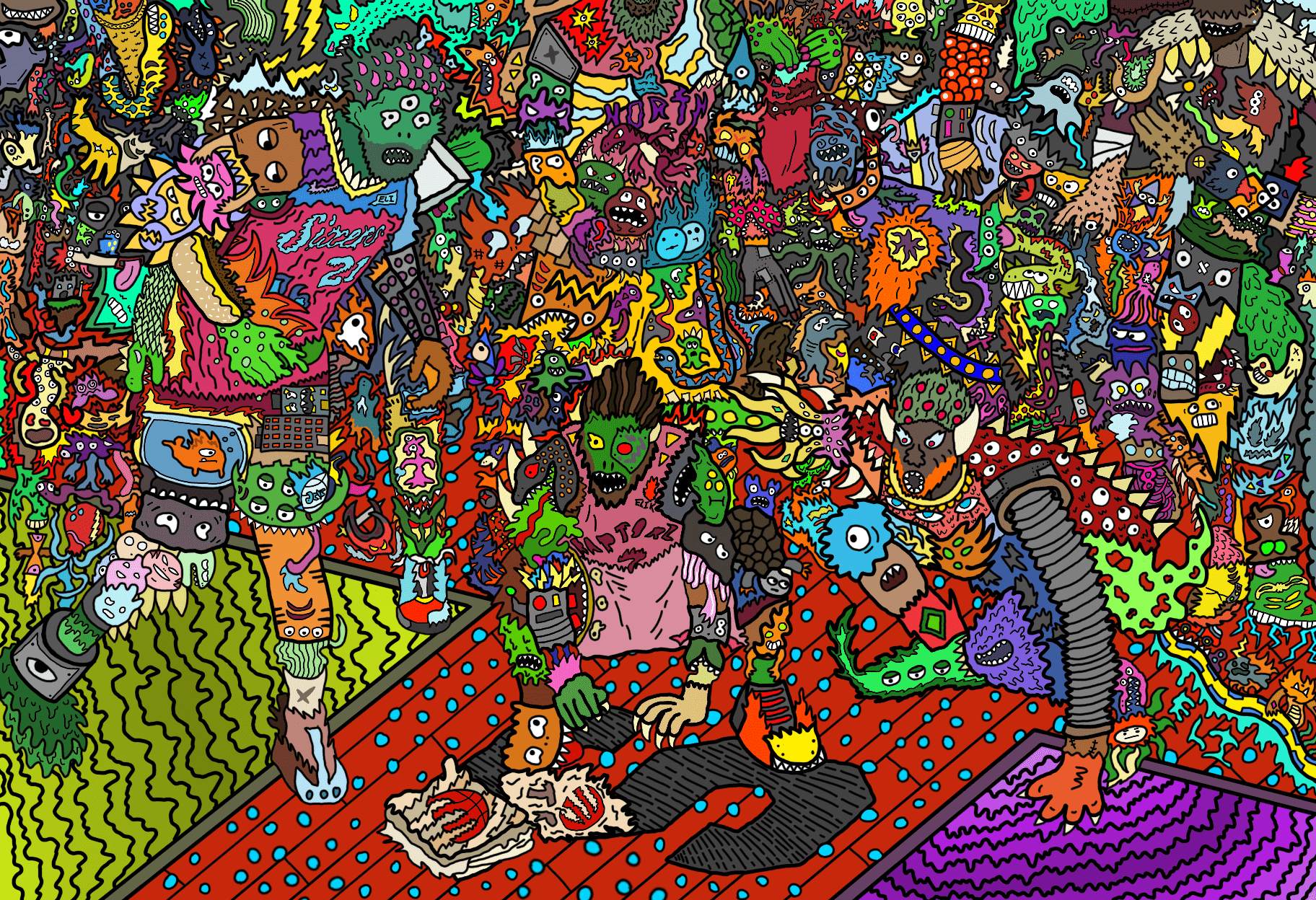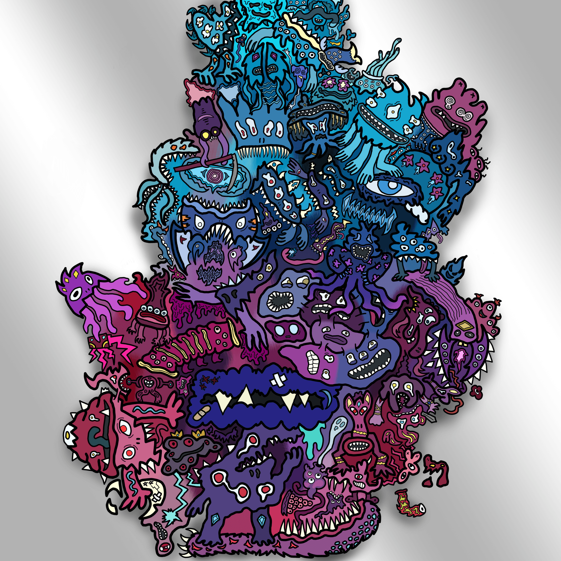 For as long as I can remember. I have always been drawing. Inspired by the cartoons and comics I loved as a child, the detailed, intricate monsters that cover whatever page that’s in front of me have been a prevalent part to my identity as a designer. This is the primary way I choose to express myself, and it’s also a representation of how I see the world. As I got older and more familiar with my style, I began to integrate these monsters in much larger pieces, as well as my own design work. I have created countless pieces that show off the intricacies of my style, with each and every detail hand-drawn by me.