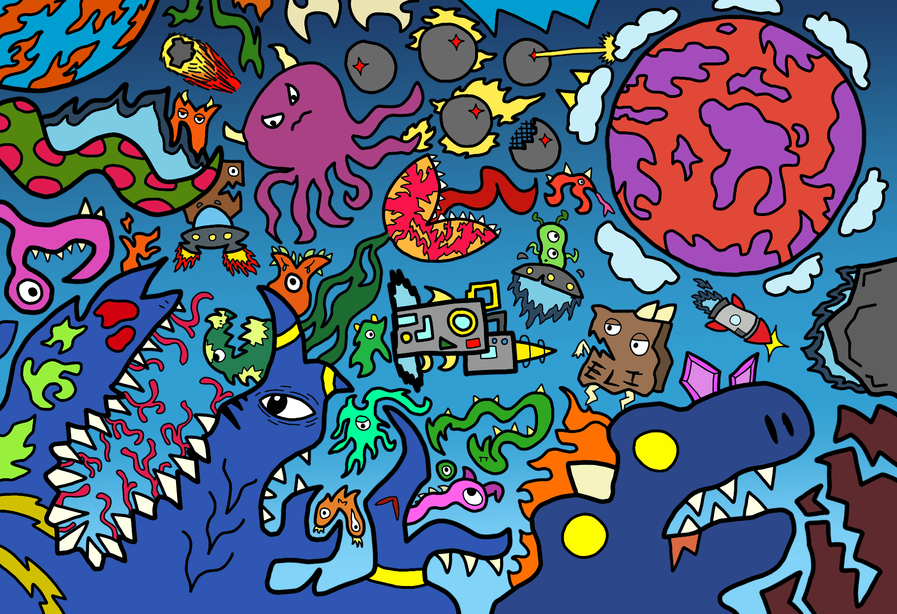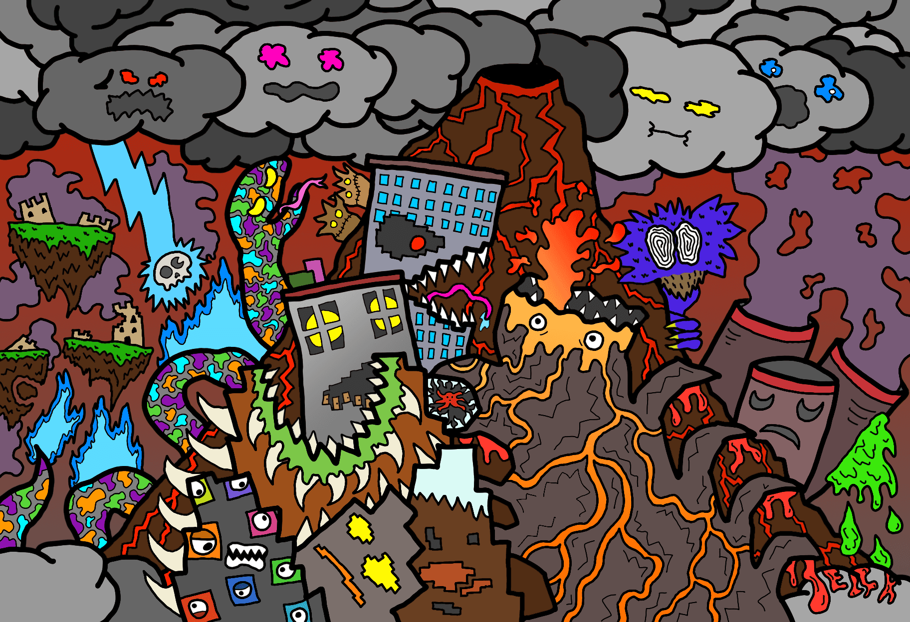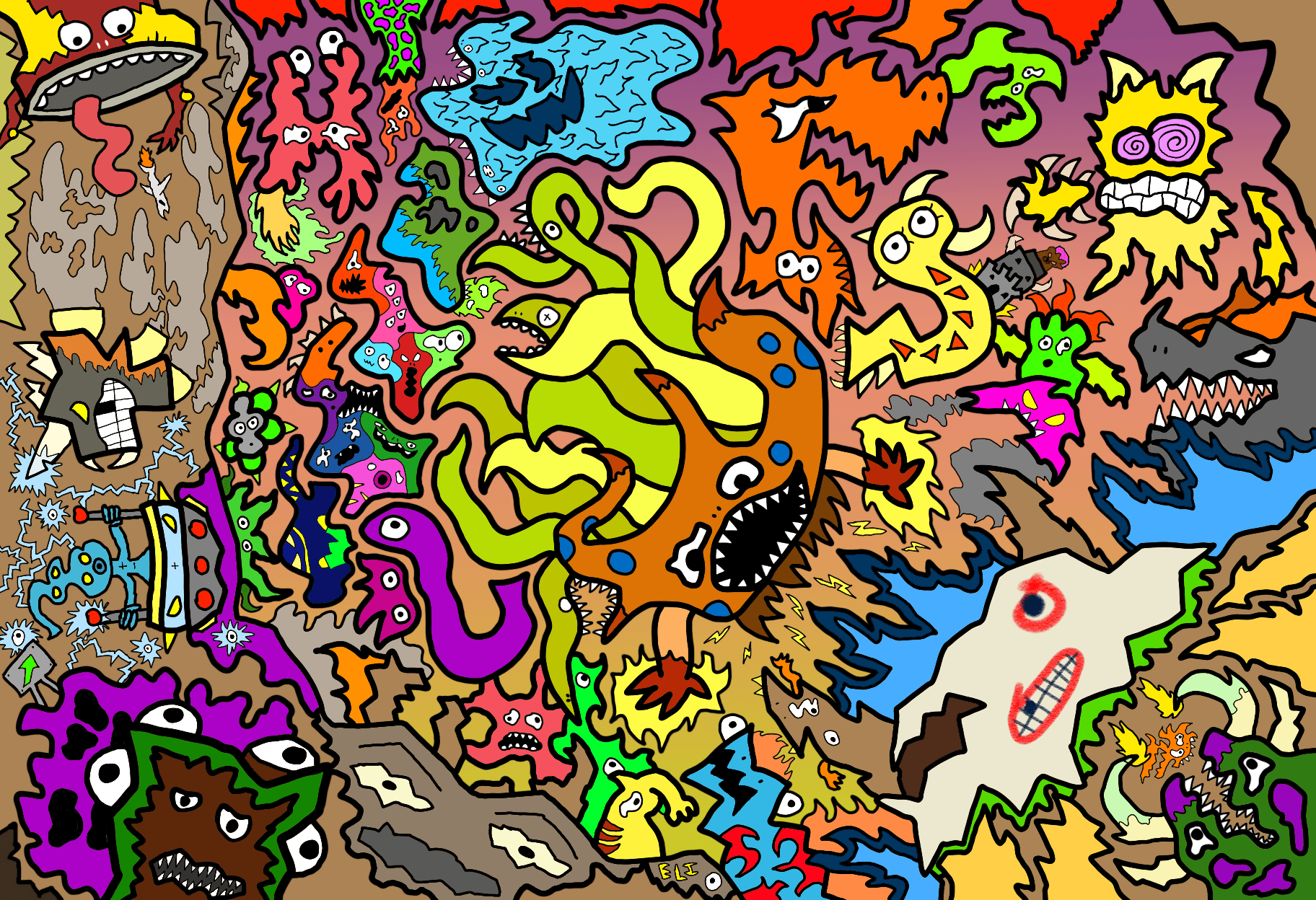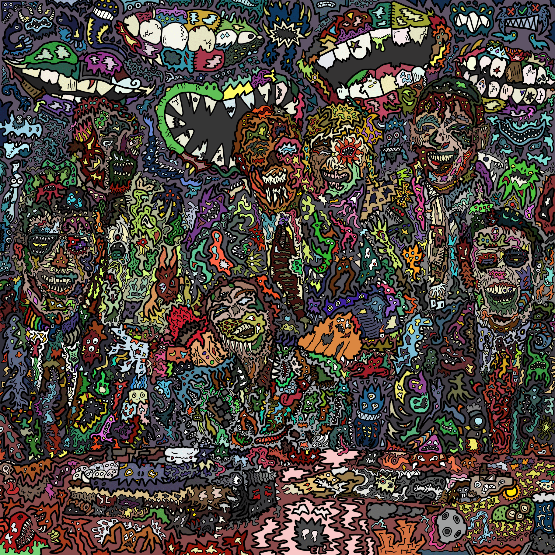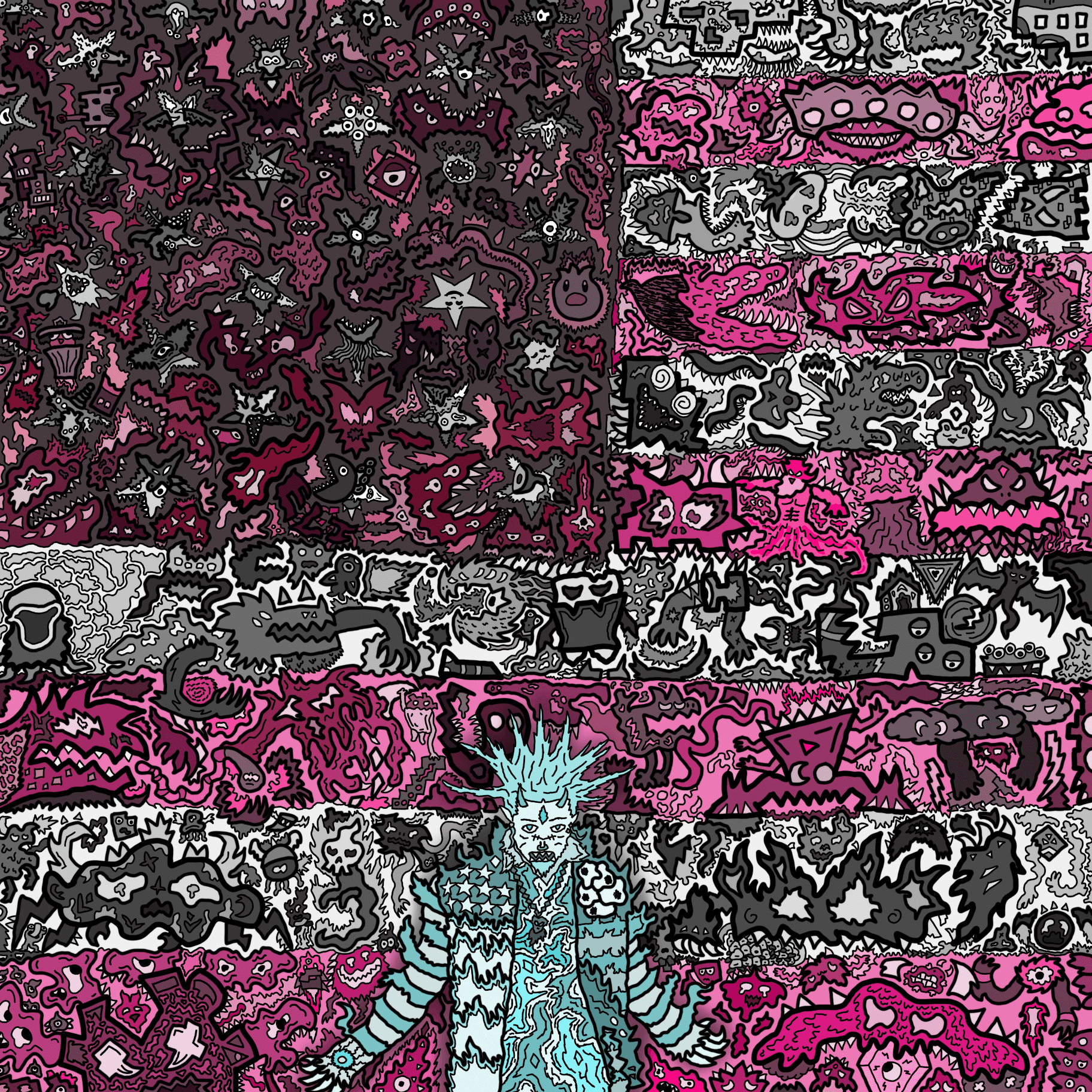 For as long as I can remember. I have always been drawing. Inspired by the cartoons and comics I loved as a child, the detailed, intricate monsters that cover whatever page that’s in front of me have been a prevalent part to my identity as a designer. This is the primary way I choose to express myself, and it’s also a representation of how I see the world. As I got older and more familiar with my style, I began to integrate these monsters in much larger pieces, as well as my own design work. I have created countless pieces that show off the intricacies of my style, with each and every detail hand-drawn by me.