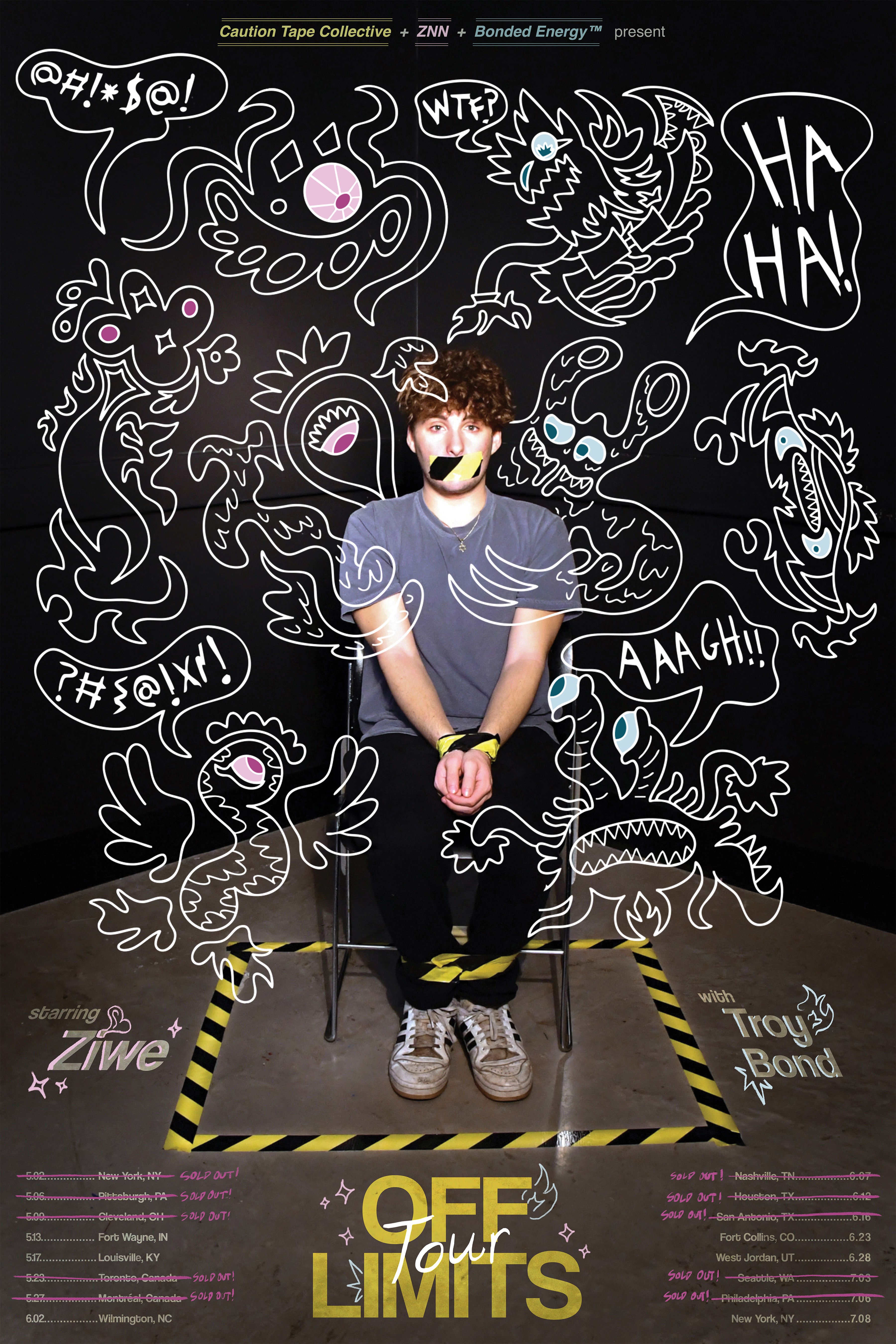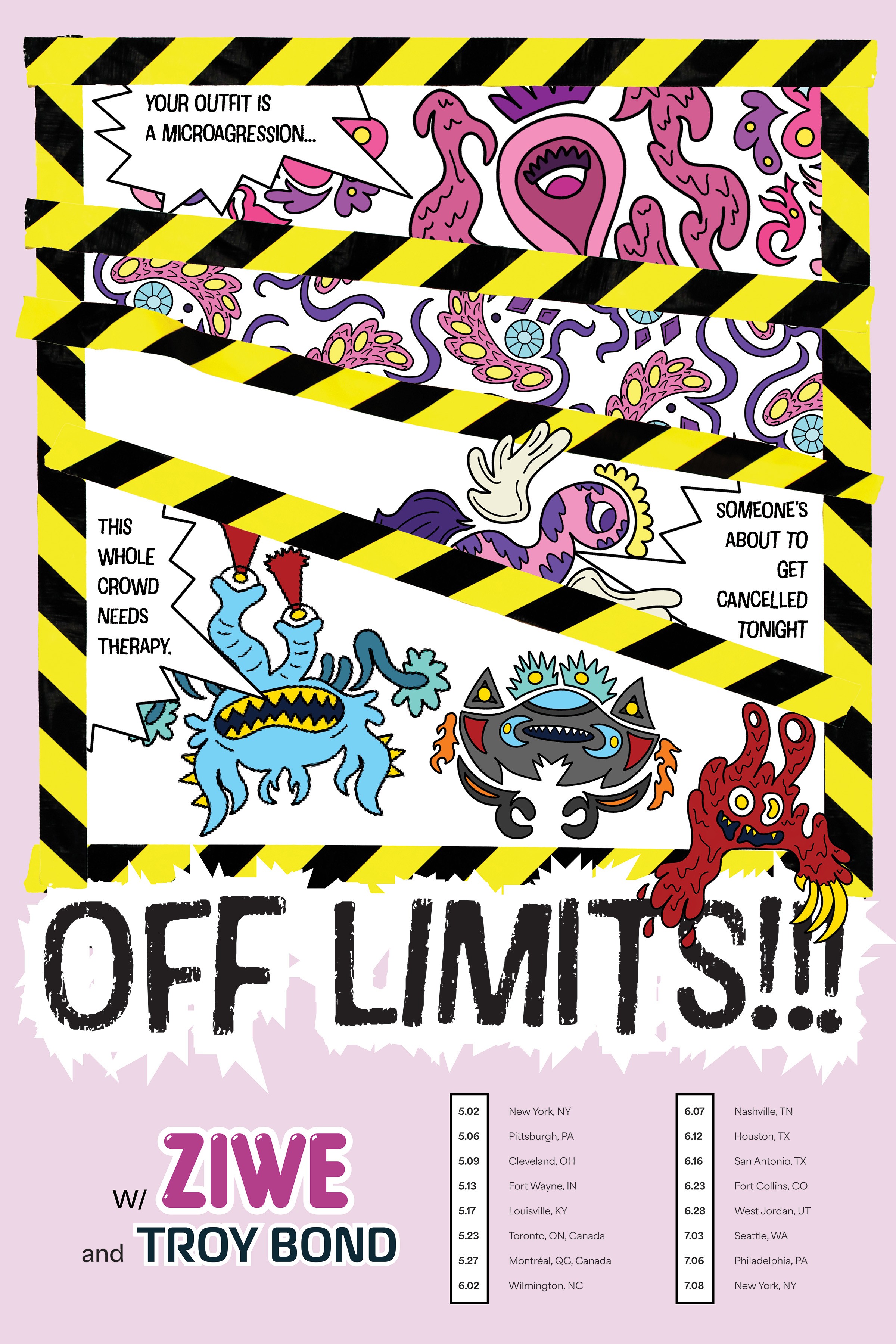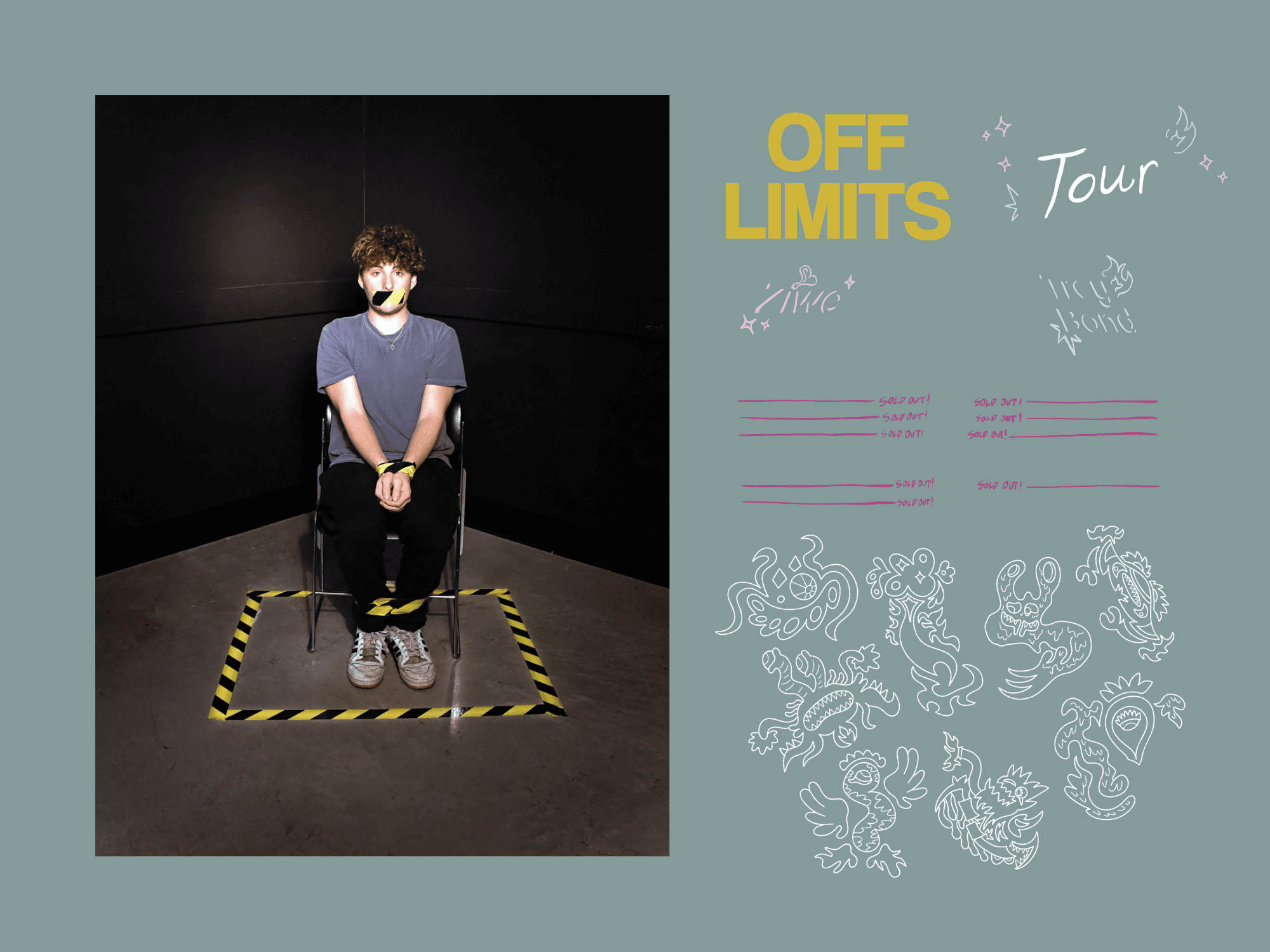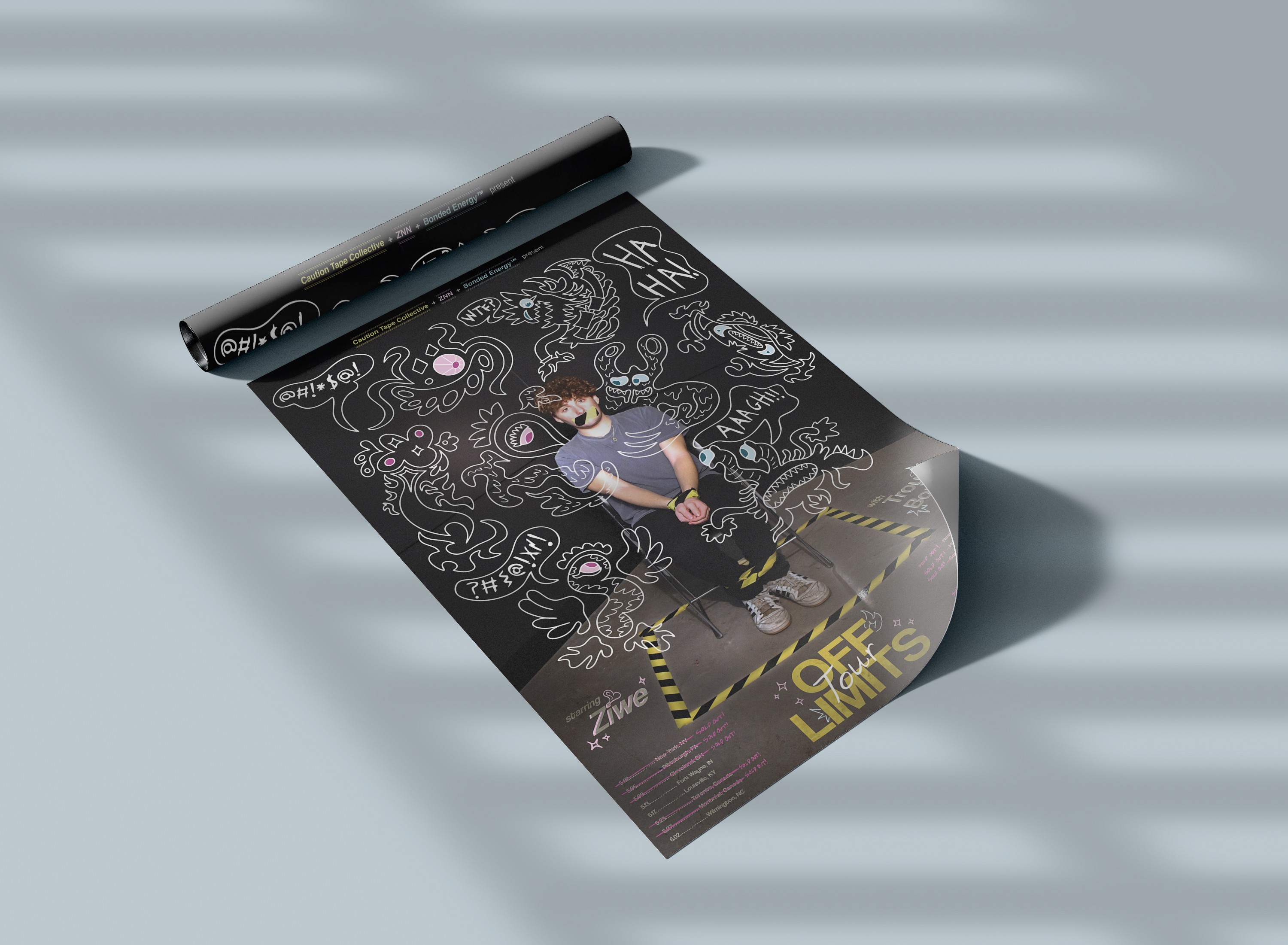 This poster exemplifies the idea of what is “off limits” in a surreal, unconventional sense. Along with my partner Ava, we combined our own personal styles and ideas to create a fictional comedy tour poster, thinking of ways to defy physical limits through design. Using a combination of typography, photography, and illustration, we created a poster that captivates audiences by placing fictional and surreal elements into a real and familiar setting. All photos, illustrations, and other works were fully created by Ava and I.